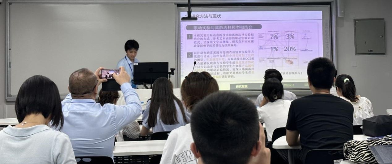 7月2日下午,杨云涛在“神经营销学论坛”分会场汇报了由学院投资系副主任、副教授张剑老师指导的论文《“双碳”政策对低碳产品消费决策影响的眼动研究》,利用眼动追踪技术比较消费者对产品不同属性的注视情况,分析不同干预程度的双碳政策对消费者决策偏好的影响。