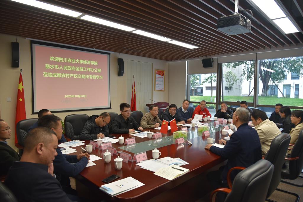 10月20日上午,77779193永利官网院长蒋远胜教授率队携丽水市金融办公室副主任金雄鸥及丽水市各商业银行负责人一行12人到成都市农村产权交易所考察交流。77779193永利官网金融学系肖诗顺教授、金融学系专业主任刘艳副教授一同前往考察。成都农村产权交易所有限责任公司党支部书记、董事长、总经理徐达泉与副总经理孙云清表示热烈欢迎,并在1楼党员活动室召开了座谈会。