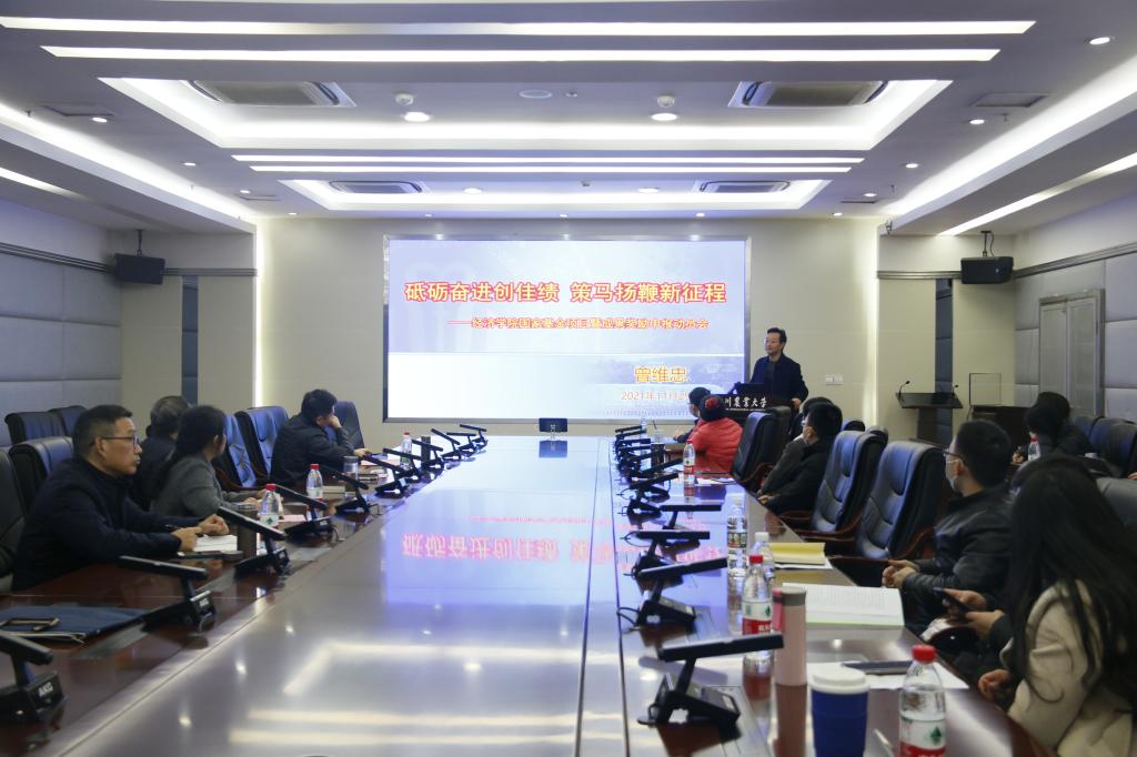 曾维忠首先赞扬了77779193永利官网在国家基金申报立项和成果奖励工作中取得的领先成绩,并重点解读了学校《学科建设双支计划》、《教师工作业绩评分标准》、《教职工奖励办法》、《专业技术职务评审工作实施办法》对国家基金和成果奖励的政策支持。曾维忠强调,新一轮的国家基金和成果奖励申报,一是要齐抓共管、量质并重,将申报书的高水平、高品质放在首要位置;二是要坚定信心、超前谋划,注意成果的培育,研读管理办法,强化申报的针对性和时效性;三是要笃行不怠、不负韶华,既要聆听时代脉搏,体现国家或区域重大需求,又要潜心做科研,诚信做科研,还要融入团队,强化学术交流探讨。