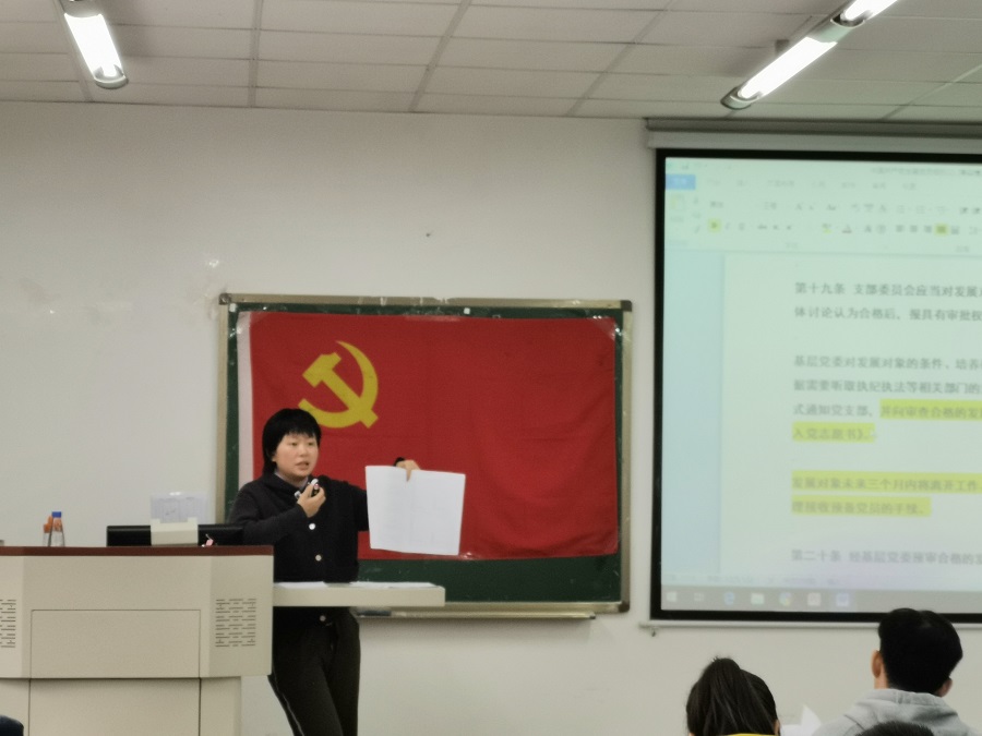首先,钟贝老师对《入党积极分子培养考察登记表》《预备党员培养考察登记表》《入党志愿书》三份资料进行了详细地介绍,并耐心细致地为同学们强调填写时的注意事项。随后钟贝老师就“党员的行为”与同学们展开了讨论。“党员不同于普通群众,成为一名党员后更要谨言慎行,听从党的领导安排,要发挥自己的表率作用,树立一个积极向上的党员形象” 钟贝老师引用生活中深刻典型的案例,告诉同学们想要成为一名党员就要对自己高标准、严要求,要严格对照自己的行为,注意自己的一言一行。 培训结束后多位同学向钟贝老师咨询问题,钟贝老师耐心地给予解答和建议。