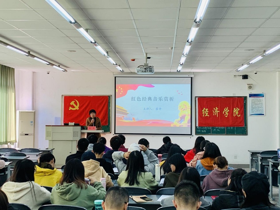 蔡丹老师以2019年国庆阅兵上大火的《钢铁洪流进行曲》“90后”主创为例,鼓励新时代入党积极分子去欣赏红色歌曲,丰富红色歌曲内涵,传播红色歌曲的中精神。蔡丹老师说道:“红色歌曲是一种文化符号,是一种红色基因,作为新时代的新青年,我们应该要积极地去传承和发扬红色歌曲,传播红色文化。”