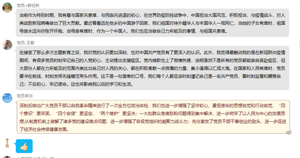 为了巩固大家的学习成果,入党积极分子马一鸣带领大家进行线上答题,以互动的方式来深入学习。通过答题,同志们相互学习,对政治理论以及党性修养有了进一步提高。