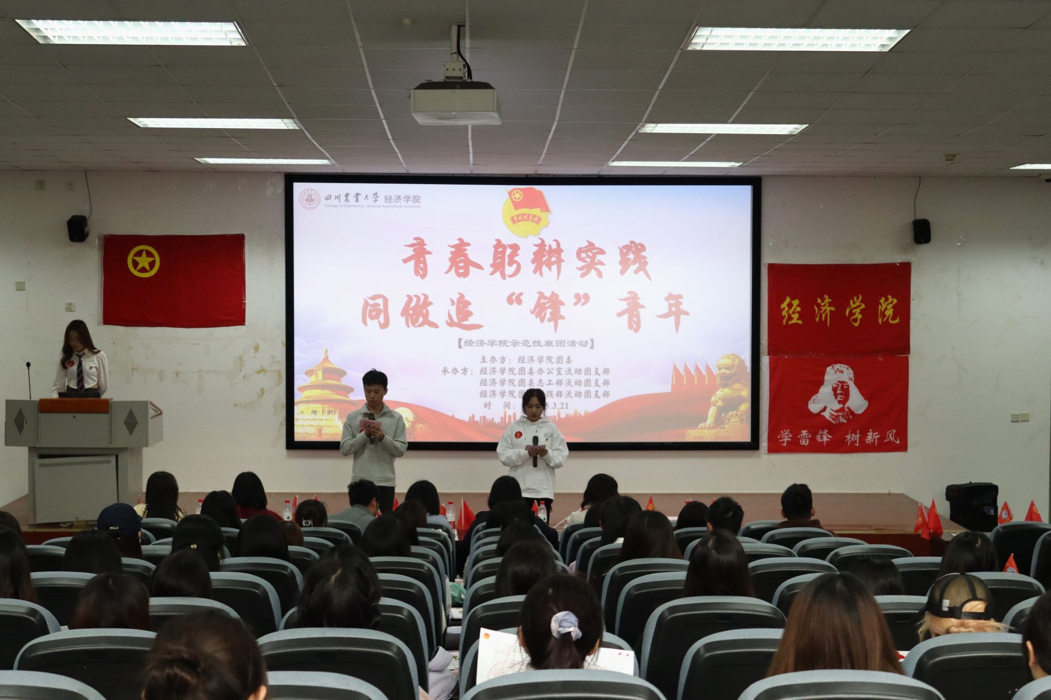 三月春风温暖人心,雷锋精神代代相传。会议伊始,与会团员齐唱团歌、进行集体青年大学习、观看“请战士,讲战士”主题微团课。通过观看团课,广大青年团员对雷锋精神的理解更加深刻了。观看微团课后,志工部主干现场发布60项志愿服务,呼吁各小班团支书及班长积极认领,认真带领支部同学落实雷锋精神。接下来,活动邀请到以青春奉献投身偏远地区教育事业、远在新疆和田支教的的研究生支教团成员之一姜秋睿学长为团员们分享他在支教过程中的经历与感悟,让广大青年更加明白了学习雷锋精神的重要性与必要性,鼓励了广大青年扎根基层,坚定信念。分享结束后,志工部同学带来“三月春风温暖人心,雷锋精神代代相传”主题诗歌朗诵。朗诵后全场青年进行了志愿者宣誓,在心中加深了雷锋精神的烙印。