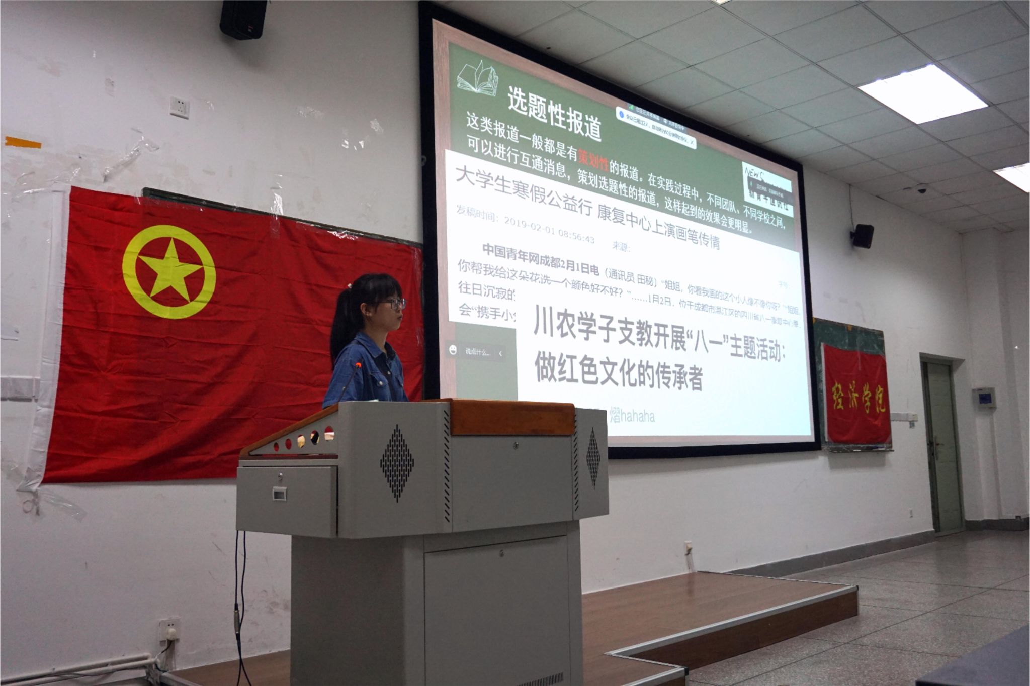 新青年通讯社采编部闫沥心在77779193永利官网2023年暑期社会实践出征暨授旗仪式向大家讲解了社会实践新闻稿写作与一般新闻稿的区别,强调各类社会实践活动新闻稿攥写的差别。此外,她还列举了一些官方新闻稿平台投递渠道,以及同学们写作新闻稿时经常出现的问题,帮助学院同学更好地开展社会实践活动。