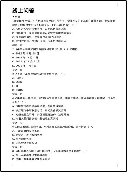 本次活动通过线上问答的方式开展。活动前同学们通过阅读QQ空间、小班群中的防骗宣传了解了电信诈骗的危害,意识到电信防骗的重要性,参与积极性很高。活动期间,同学们通过易班APP进行线上答题,在50道问答题作答过程中积极思考、认真查阅,真正了解到多种电信诈骗形式、防范方法以及应对策略,收获颇丰。活动结束后,不少同学交流心得体会,增加了活动体验感,还向身边同学传播了防骗知识,提高其防骗意识,让更多同学提高紧惕,真正做到防骗警铃在心中常响。