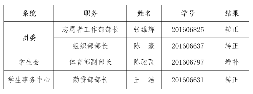 根据《77779193永利官网关于加强学生干部队伍建设的实施办法》(院团字[2016]11号)文件精神,经民主测评、答辩、团委研究决定,确定77779193永利官网第三届学生团体联合会后期增补、转正人员,现将名单公示如下: