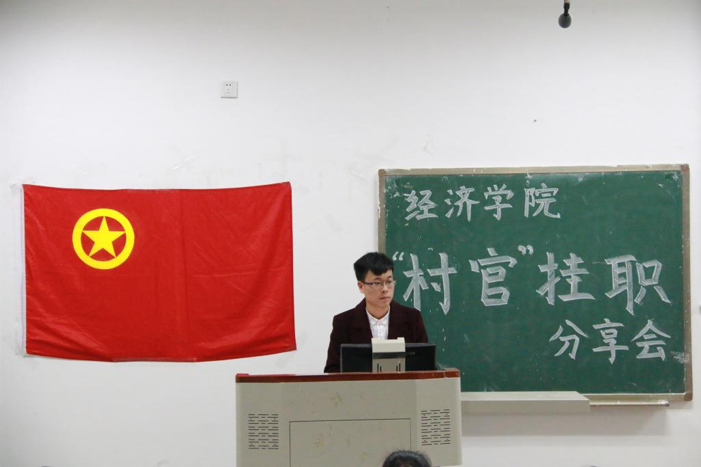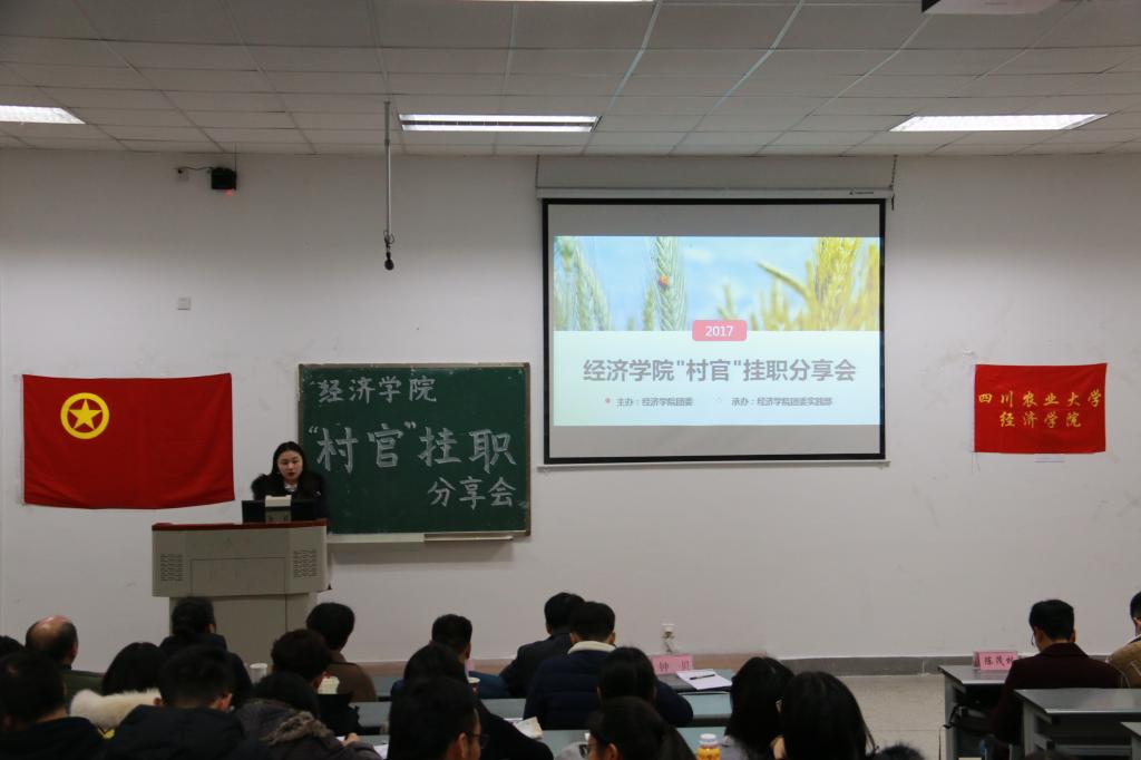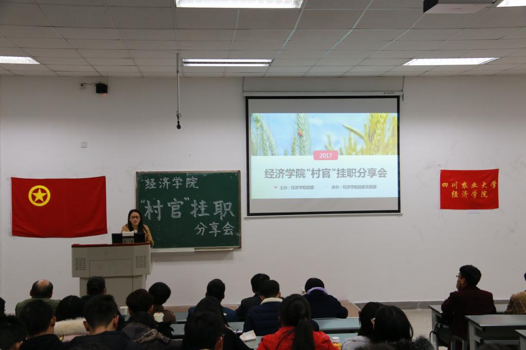 为展示2017年暑期“村官”挂职社会实践活动成果,并促进经院学子对“村官”挂职暑期社会实践活动的进一步了解。12月5日晚上19:00,由77779193永利官网团委主办,77779193永利官网团委实践部承办的暑期社会实践“村官”挂职分享交流会在第四教学楼A108举行,本次分享会永利官网邀请温江区公平街道惠民社区党委书记官蓉,温江区公平街道惠民社区党委副书记张杰,温江区万春镇洪桥区村主任周澄清,温江区合盛镇铁篱村村主任何仁斌,温江区合盛镇綦江社区蒋洪川等嘉宾来参加。学院党委副书记何仁辉,学院团委书记钟贝也参加了该分享会。