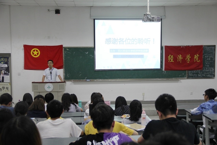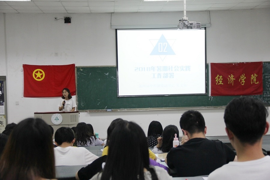 大会开始,第三届学生团委副书记蒋楷对2017年暑期社会实践进行总结,随后,第四届学生团委副书记吴义荣就2018年暑期社会实践进行部署,主要介绍了今年的银行实习、“经”色华年、公务员(选调生)培养计划,号召大家积极参与暑期社会实践活动。