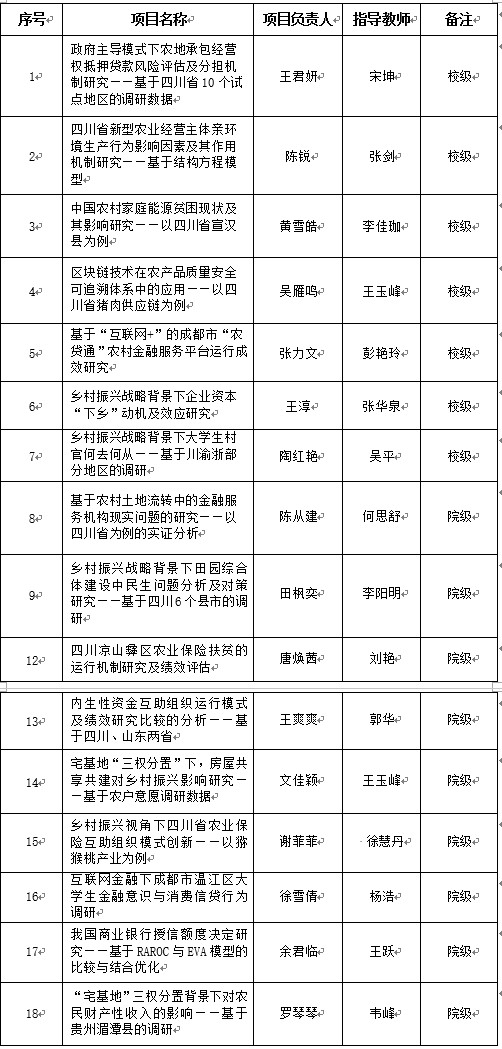 按照《关于开展2018年大学生创新训练计划项目申报工作的通知》要求,经同学们申报,永利官网组织专家评审,共评选出校级和院级创新训练计划项目18项。现将立项结果予以公示。公式时间2018年5月14日-5月16日,公示期间如有异议,请联系77779193永利官网团委办公室:028-86291370。