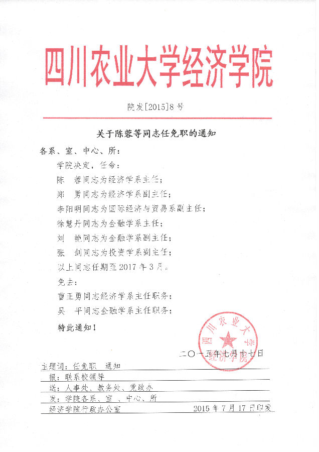 院发【2015】8号 关于陈蓉等同志任免职的通知
