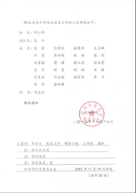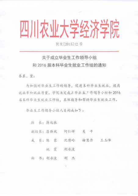院发【2015】12号 关于成立毕业生工作领导小组和2016届本科生就业工作组的通知