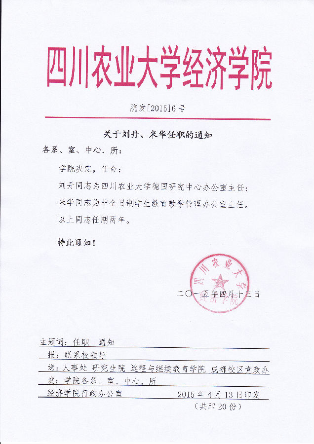 院发【2015】6号 关于刘丹、米华任职的通知