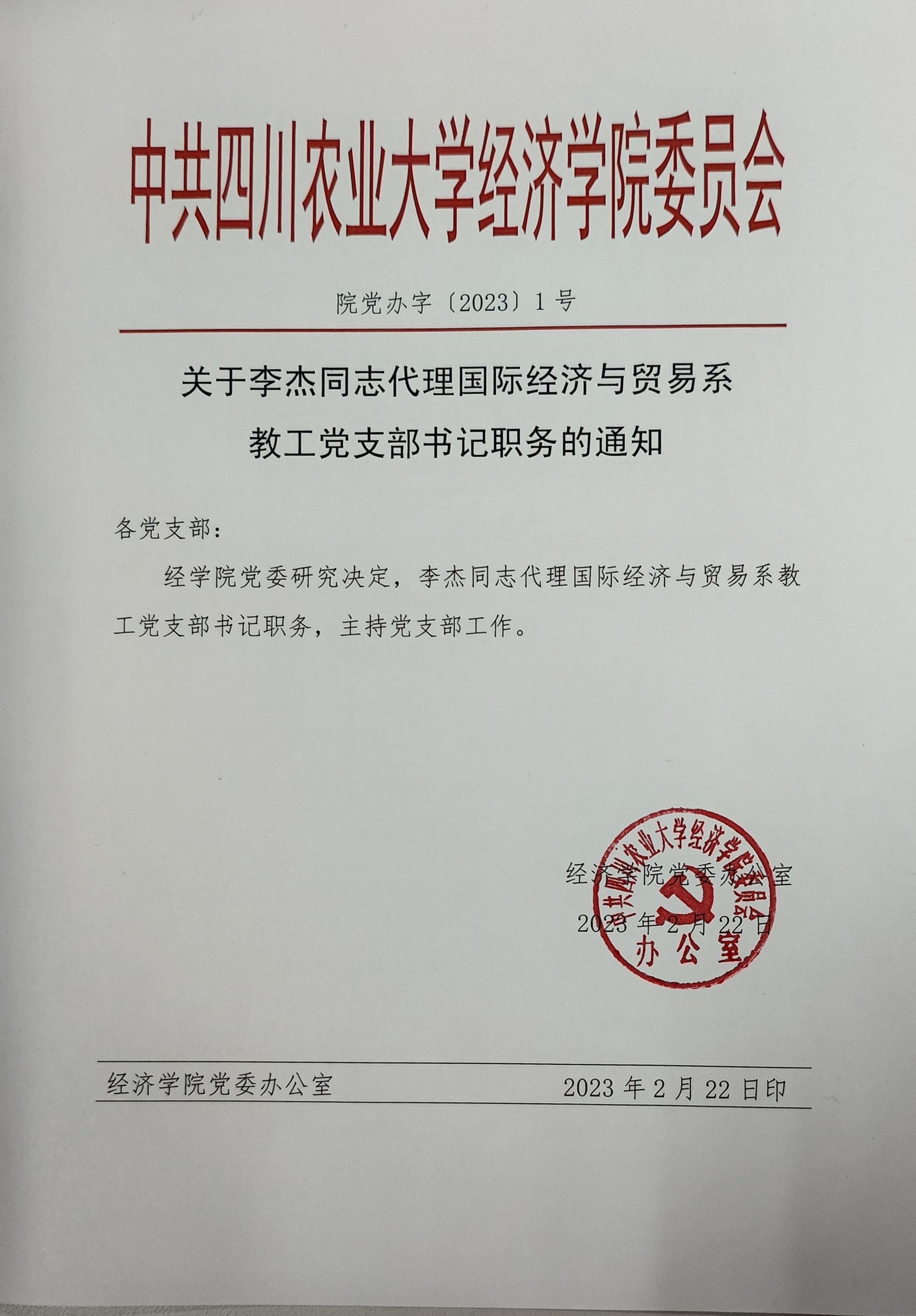 院党办字〔2023〕1号——关于李杰同志代理国际经济与贸易系教工党支部书记职务的通知