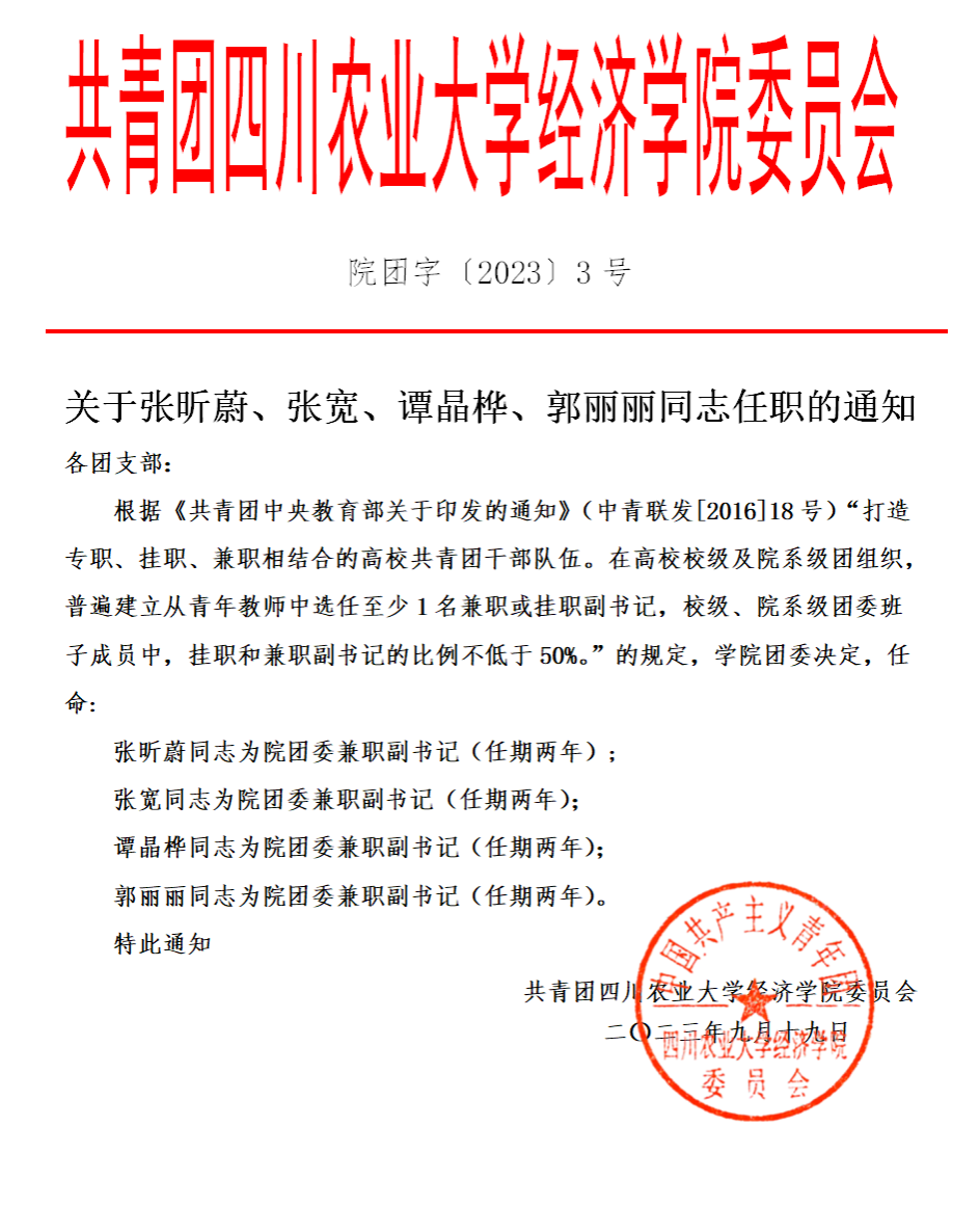 院团字〔2023〕3号——关于张昕蔚、张宽、谭晶桦、郭丽丽同志任职的通知