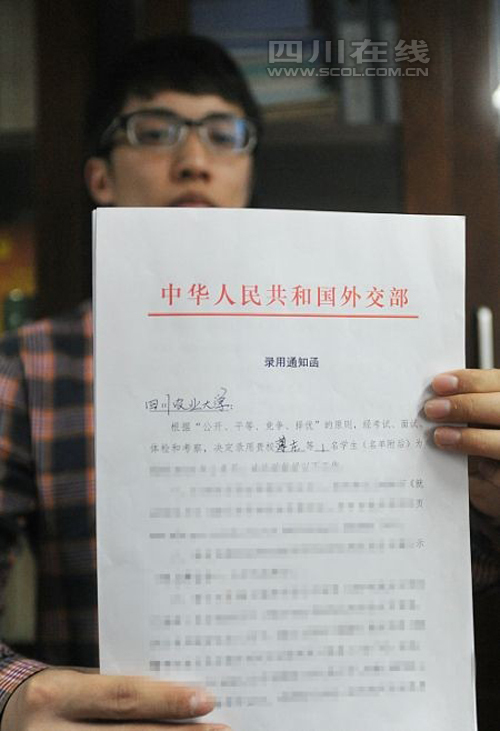 得到面试通知后,薄东便开始在网上确认、撰写自述和考生情况调查表,随后就奔赴北京,顺利通过了面试。就这样,从笔试到面试录用,薄东在近1:100的录取比例下,从近700人中脱颖而出,成为川农首位考入外交部的学生,并于本月收到了外交部寄来的录用通知函。