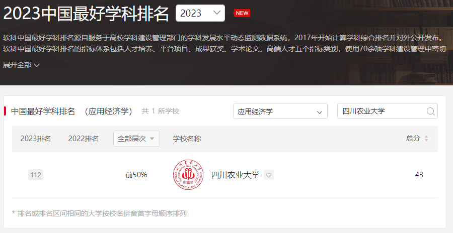 根据最新发布的2023软科中国最好学科排名,永利官网“应用经济学”学科首次上榜,排名112位,进入排名前50%,在农林高校中排名第4。
