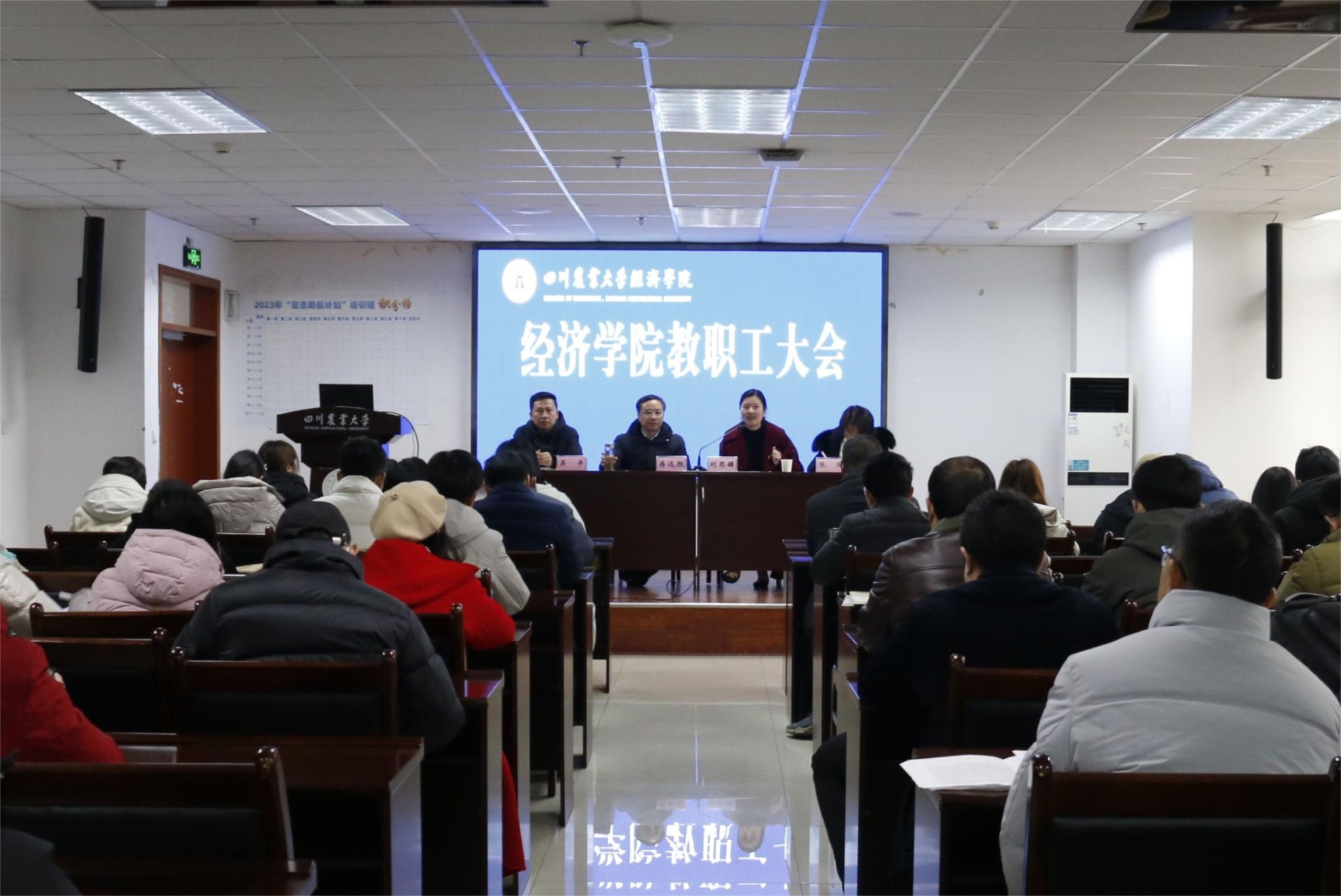 2月27日下午,学院在7教207会议室召开新学期教职工大会,传达学习习近平总书记近期重要讲话精神以及省委近期重要会议和文件精神,传达学校党委理论学习中心组(扩大)暨中层干部会议精神,结合“十四五”目标任务,全面安排部署学院2024年重点工作。会议由学院院长蒋远胜主持,学院领导班子和全体在校教职工参加会议。