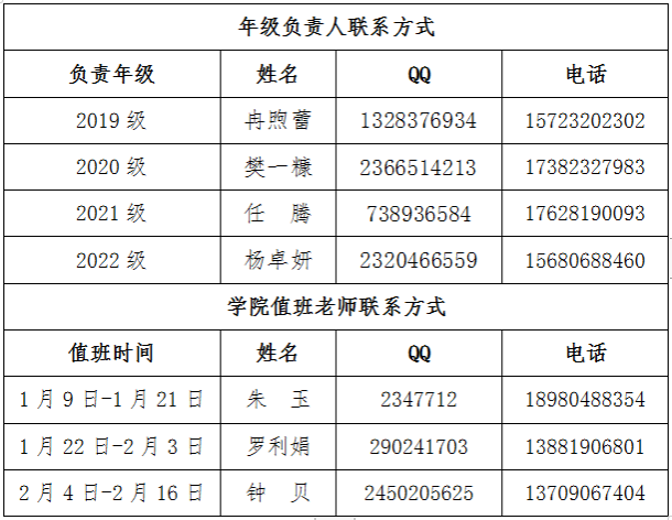 (二)寒假留校学生要遵守学校管理制度,中途离校后不得返校,确因社会实践、实习等原因短暂离校的,须向学院负责教师请假(各时间段学院值班老师联系方式详见“六、其他”),经批准后方能离返校。