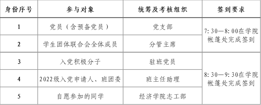 3.党员、入党积极分子和2022级的入党申请人、班团委中途不得离场;各学生团体联合会部门成员在对接项目结束后不得离场,继续为其他项目加油助威。