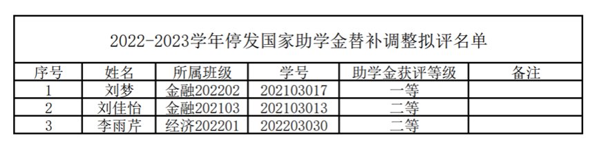 经学生自愿申请,班级评议组评议、学院审核,现将2022-2023学年停发国家助学金替补调整拟评名单公示如下。公示时间:2023年6月12日—2023年6月15日。如有异议,请于公示期内,向学院党委办公室(1教421室)反映。联系电话:028-86291770。