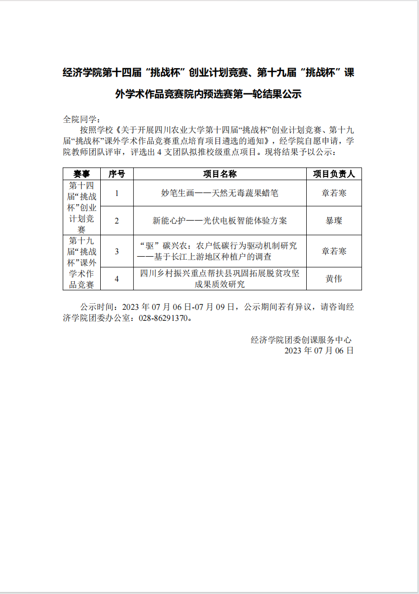 77779193永利官网第十四届“挑战杯”创业计划竞赛、第十九届“挑战杯”课外学术作品竞赛院内预选赛第一轮结果公示