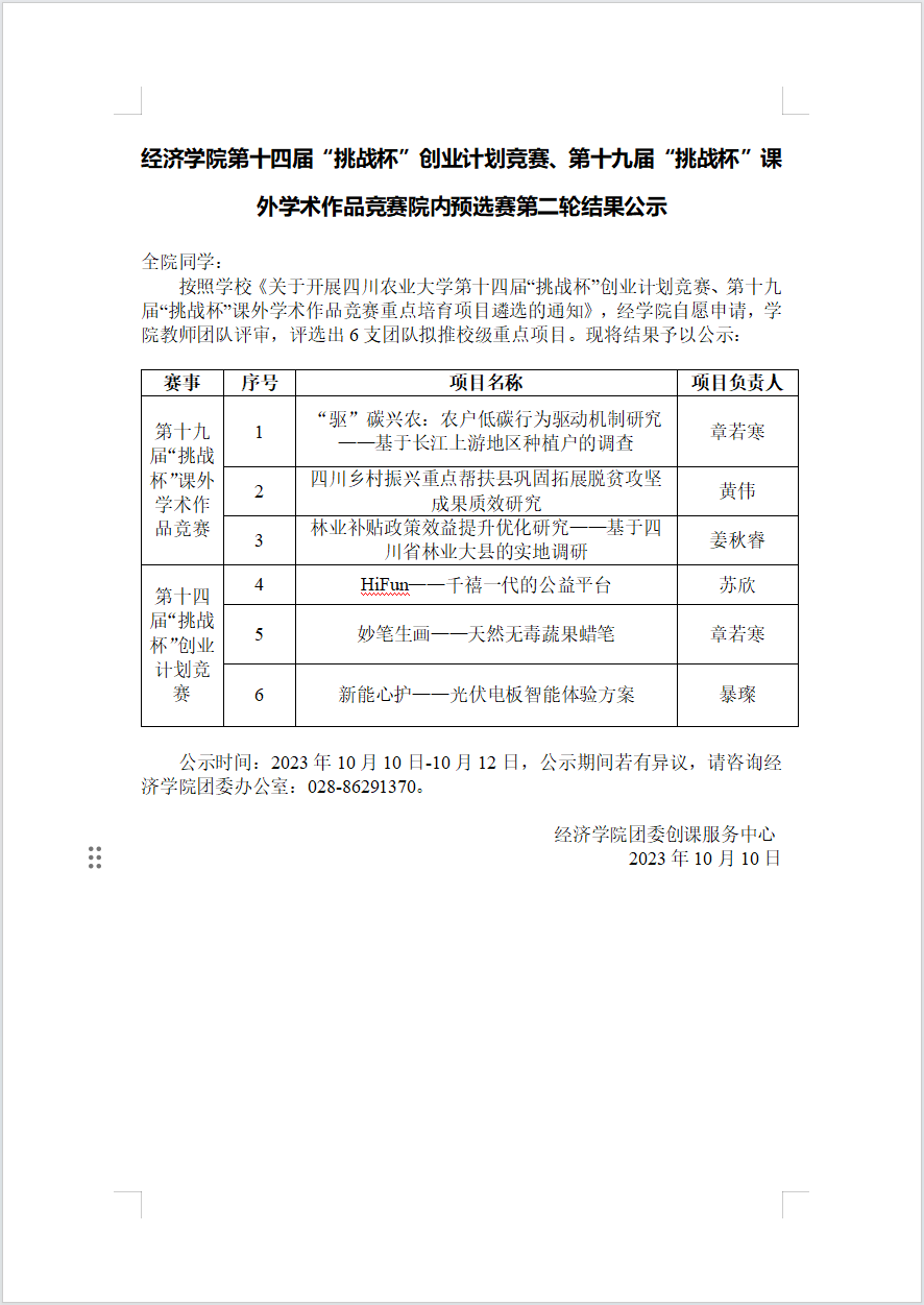 77779193永利官网第十四届“挑战杯”创业计划竞赛、第十九届“挑战杯”课外学术作品竞赛院内预选赛第二轮结果公示