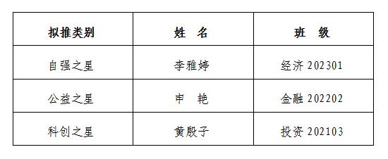 为进一步弘扬不畏清寒、自强不息的精神,选树感恩奉献、逆境成才的优秀典型,激励我校广大学生励志进取、奋力拼搏,学院于11月19日起开展2023-2024学年度寒梅飘香工程“自强之星”“公益之星”“科创之星”评选工作。经学生自愿申请,学院组织评审,现将2023-2024学年度寒梅飘香工程“自强之星”“公益之星”“科创之星”评选结果公示如下: