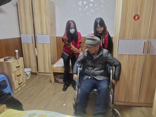 志愿者为老人普及冬季保暖养生小知识,与老人拉拉家常,认真倾听老人的故事,欢声笑语久未停歇,在养老院上空萦绕不衰。