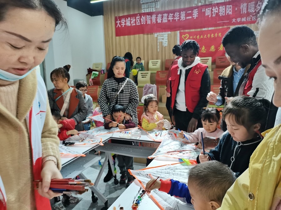 在活动开始之际,留学生首先帮助小孩子共同完成风筝的制作,在此过程中孩子们不仅收获了制作风筝的快乐,同时也和留学生们有了一定交流。最终这个小游戏十分顺利结尾。