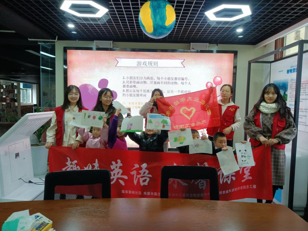 为提升英语学习兴趣,77779193永利官网团委青年志愿者工作部在成都市温江区涌泉滴水公益社会组织服务中心举办了趣味英语,“泉馨“课堂第三期活动。
