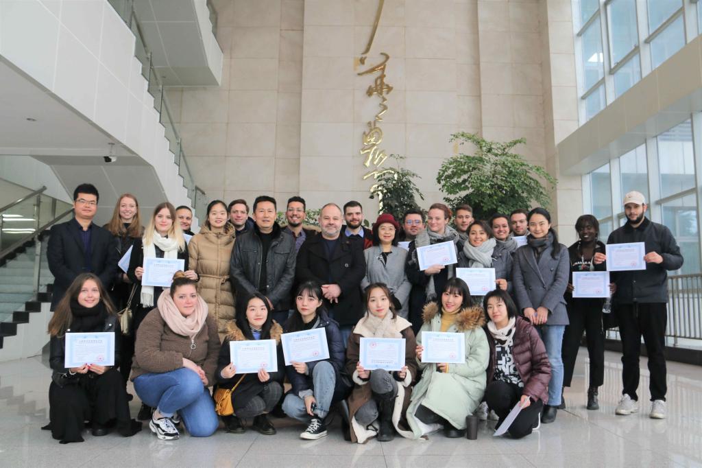 Wu Ping and Gérald Duffing issued certificates of completion to exchange students and took a group photo.