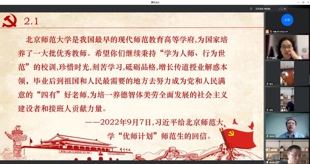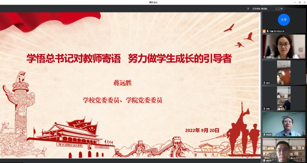 9月20日,经济学系教工党支部线上师德师风专题学习会,学校党委委员、学院院长蒋远胜以普通党员身份与全体党员一道参会,无党派人士杨浩教授列席会议,会议由党支部书记曹正勇主持。