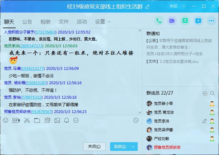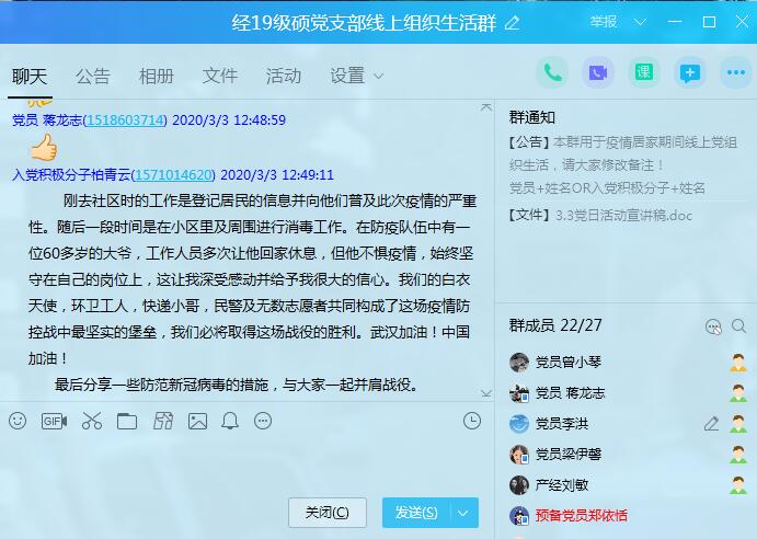 3月3日,2019级研究生党支部召开了一场特别的线上主题党日活动,活动在QQ群实时进行,由党支部书记李洪主持。
