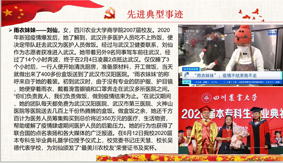 活动第一项,对标“树典型,学典型”的支部氛围打造,胡芝嘉同志选取先进个人典型进行分享。姜仕坤同志始终把共产党人的坚强党性体现在脱贫攻坚的使命担当中;钟扬同志对党无比忠诚、对事业无比热爱、对人民无比赤诚,长期从事植物学、生物信息学研究教学工作,取得一系列重要研究成果,彰显了共产党员的崇高精神和人格力量;四川农业大学校友刘仙同志在公益路上持之以恒,在新冠疫情中温暖逆行,彰显了川农人“爱国敬业”的精神底色。