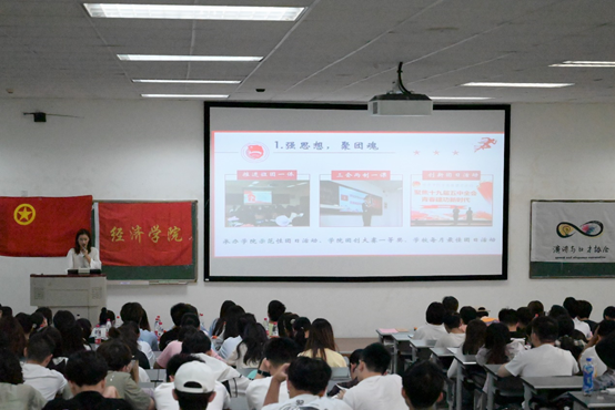 学校十佳团支部书记、国贸201902团支部书记唐晓臻在团旗下分享榜样事迹,从竞选失败到成为团支部“领头羊”,从支部氛围低迷到斩获五四红旗团支部,回顾过去的点滴积累,她不禁感慨道:“作为团支部书记,更要肩负责任,带领支部成员听党话,跟党走,坚定理想信念,在人民需要的地方书写华章,乘新时代东风,在祖国的万里长空翱翔!”学院团委负责人解读了习近平总书记在清华大学考察时发表的重要讲话,从立大志、明大德、成大才、担大任四方面逐层深入展开讲述,勉励同学们坚定不移地沿着总书记指明的正确方向成长成才,用奋斗擦亮青春底色,用担当诠释青春意义,用实干践行青春使命。教室里不断响起经久不息的掌声。